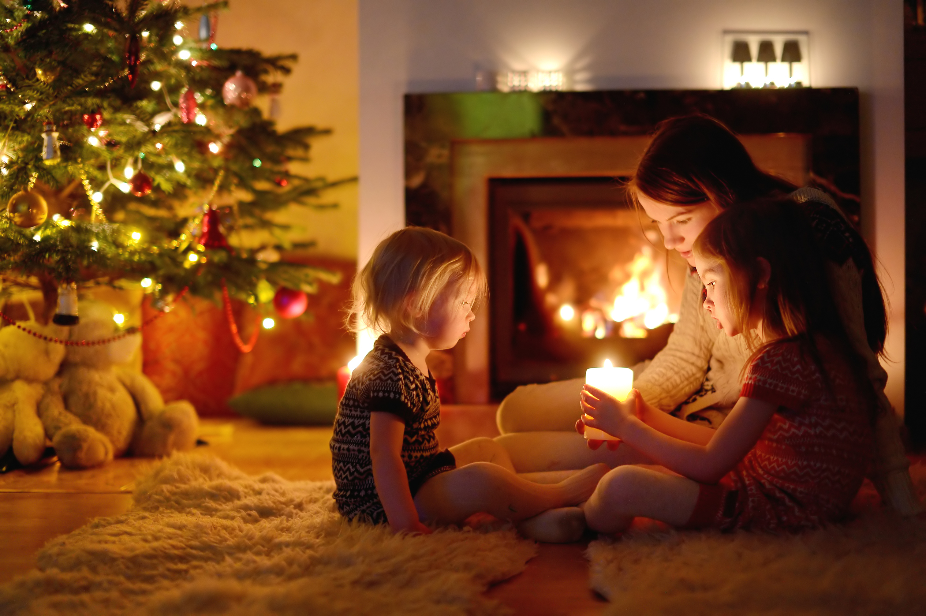 Happy family by a fireplace on Christmas